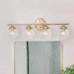 The Karmen 4-Light Modern Gold Vanity Light Interior Bathroom Bar Light Wall Sconce with Clear Seeded Globe Glass Shades brings elegant, contemporary design to your bathroom or powder room. Features with metal in a sleek antique gold finish and 4 globe shape seedy glasses attach to the single bar that inside is a bulb (not included) that will wash your space in a welcoming glow. This transitional bathroom wall mount light fixture brings a splash of mid-century modern inspiration to any space. Perfect for use as a bathroom light, powder room light, bedroom wall light, wall mount kitchen light, and so on.