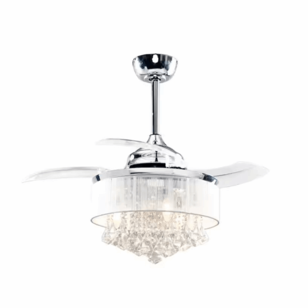 Add both cooling comfort and elegant style to your space with this modern crystal ceiling fan. The bladeless design features three retractable blades that extend for use and retract to save space when not in operation. A chrome-finished metal body pairs with a genuine crystal shade for a touch of contemporary glamour. The included remote control allows for easy adjustment of fan speeds and lighting, while the high-performance motor delivers powerful, whisper-quiet airflow.