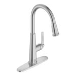 This pull-down kitchen faucet features a distinctive design with textured detailing on the handle, spray head, and base for enhanced grip and visual appeal. The high-arc spout swivels to provide generous clearance and full sink access, while the dual-function spray head extends smoothly to reach all areas. A push-button control allows switching between stream and spray modes for versatile use. Designed for single-handle operation, it includes a deck plate for flexible installation on one-, two-, or three-hole sinks or countertops.