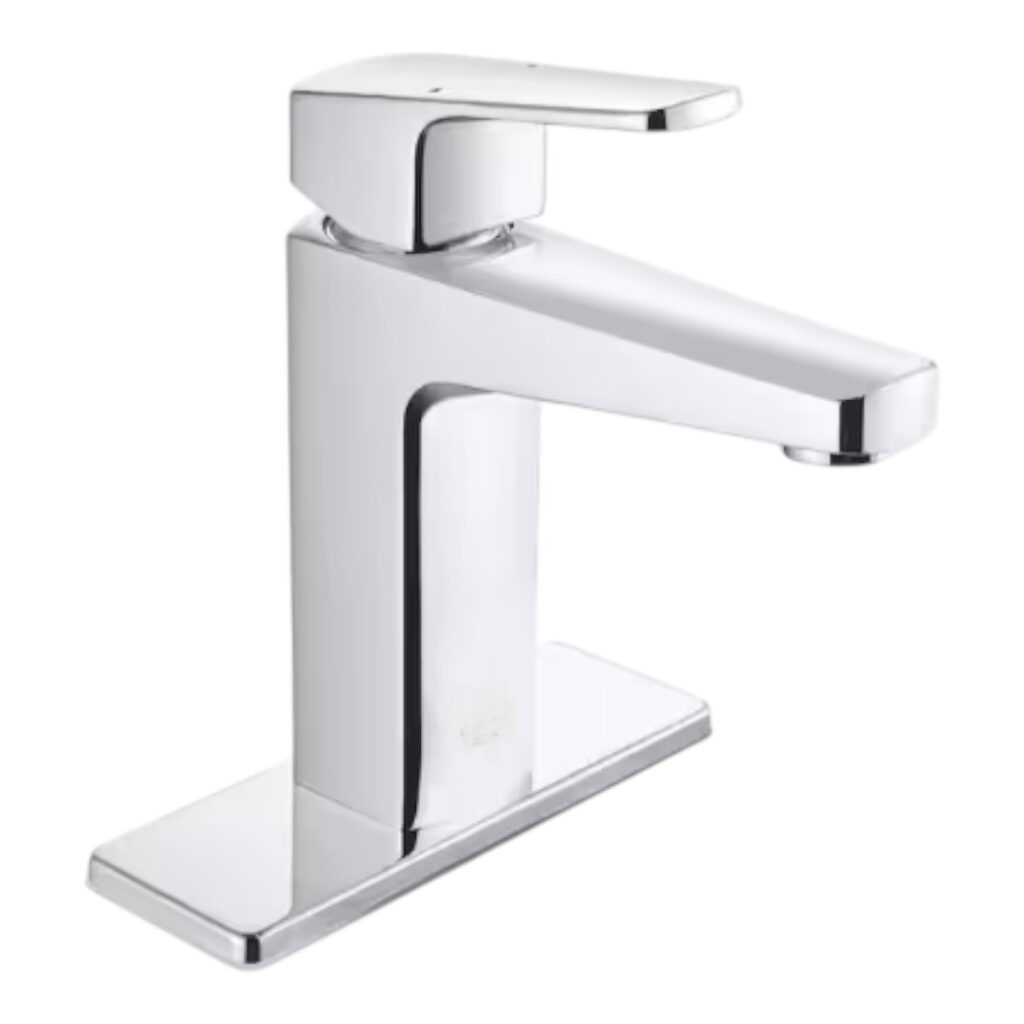 This bathroom faucet features a bold, angular silhouette softened by subtle curves, offering a modern aesthetic suitable for a wide range of interiors. The single-lever design allows for precise control of water flow and temperature. Finished in polished chrome, the surface resists dirt and scratches for low-maintenance upkeep and long-term visual appeal.