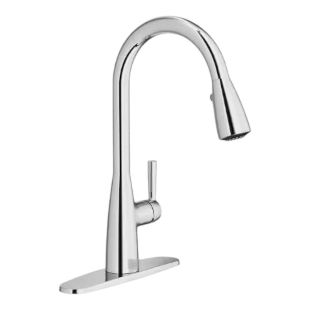This single-handle pull-down kitchen faucet features a high-arc swivel spout for easy filling and cleaning of large cookware. The ergonomic spray head offers stream, spray, and pause functions via push-button control, and retracts smoothly with an integrated motion system. Designed for flexible installation, it fits one- to four-hole sinks or countertops and includes a deck plate for optional coverage. Built with durable materials and thoughtful functionality, it supports everyday kitchen tasks with ease.