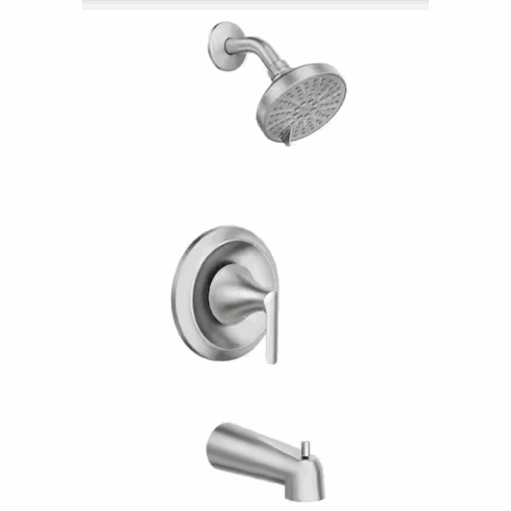 - Complete set includes valve, tub spout, showerhead, arm, flange, handle, and escutcheon
