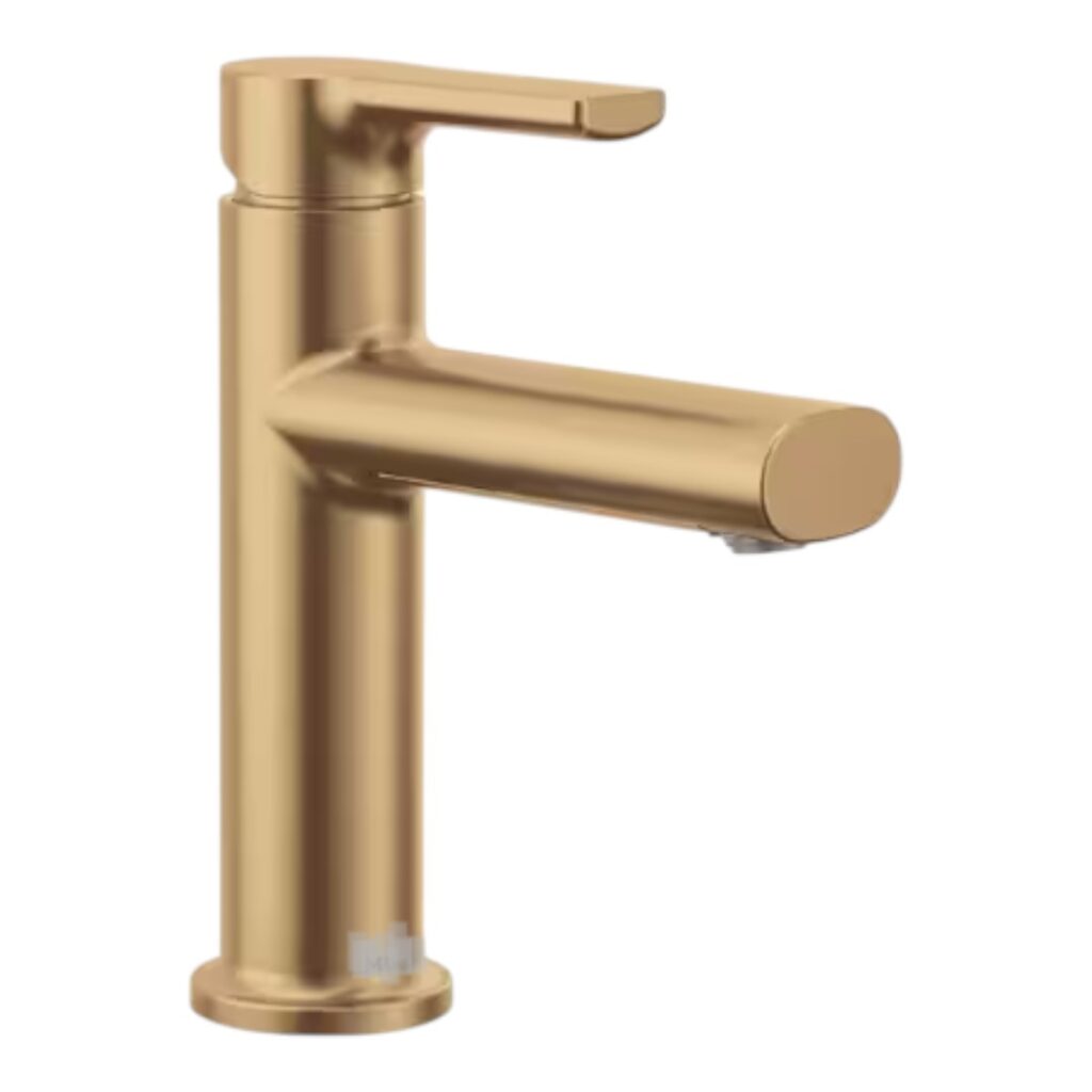 Featuring straight lines and a smooth cylindrical profile, this single-handle bathroom faucet offers a minimalist yet refined design suited for compact spaces. The handle allows for precise control of water flow and temperature. Finished in bronzed gold, it adds a contemporary and elegant touch to the bathroom.
