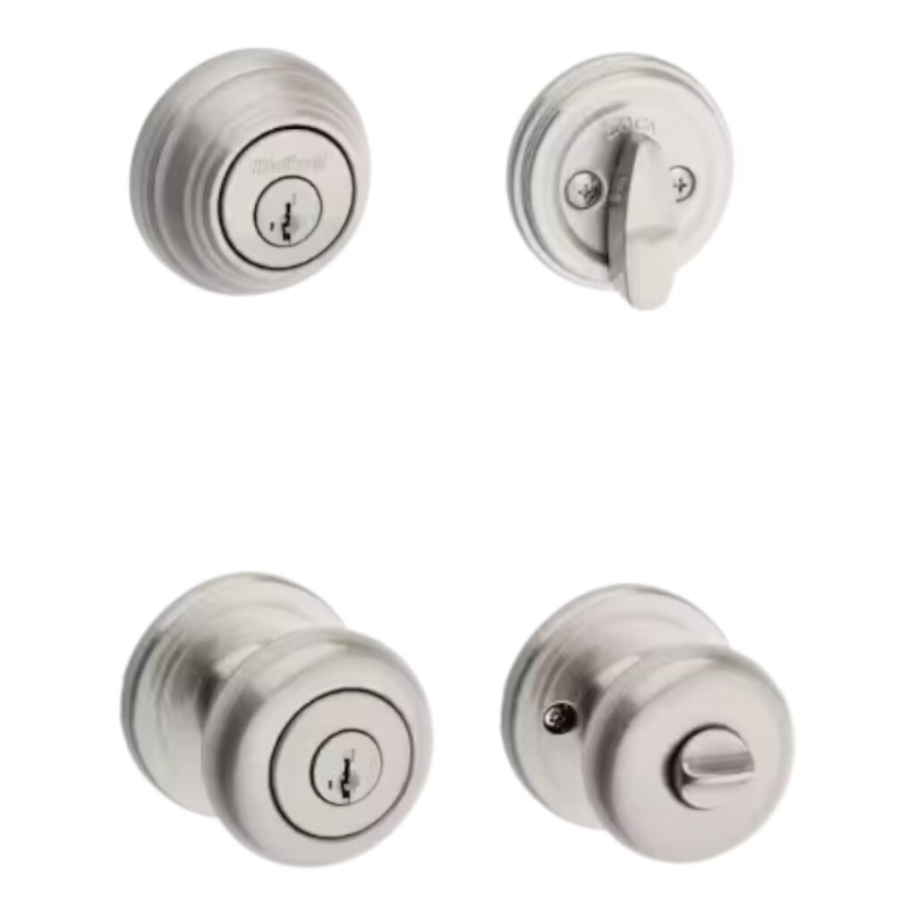 This keyed entry door knob and deadbolt combo offers enhanced security and a classic design suitable for exterior doors. The mushroom-shaped knob provides a comfortable grip and traditional aesthetic, while the satin nickel finish adds a clean, modern touch. Designed for universal handling, it fits both right- and left-handed doors and installs easily with standard tools.
