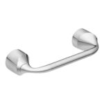 This toilet paper holder features a sleek, modern profile with a balanced blend of curved and linear elements—ideal for contemporary bath environments. The pivoting arm allows for quick roll replacement, while the included installation guide simplifies mounting.