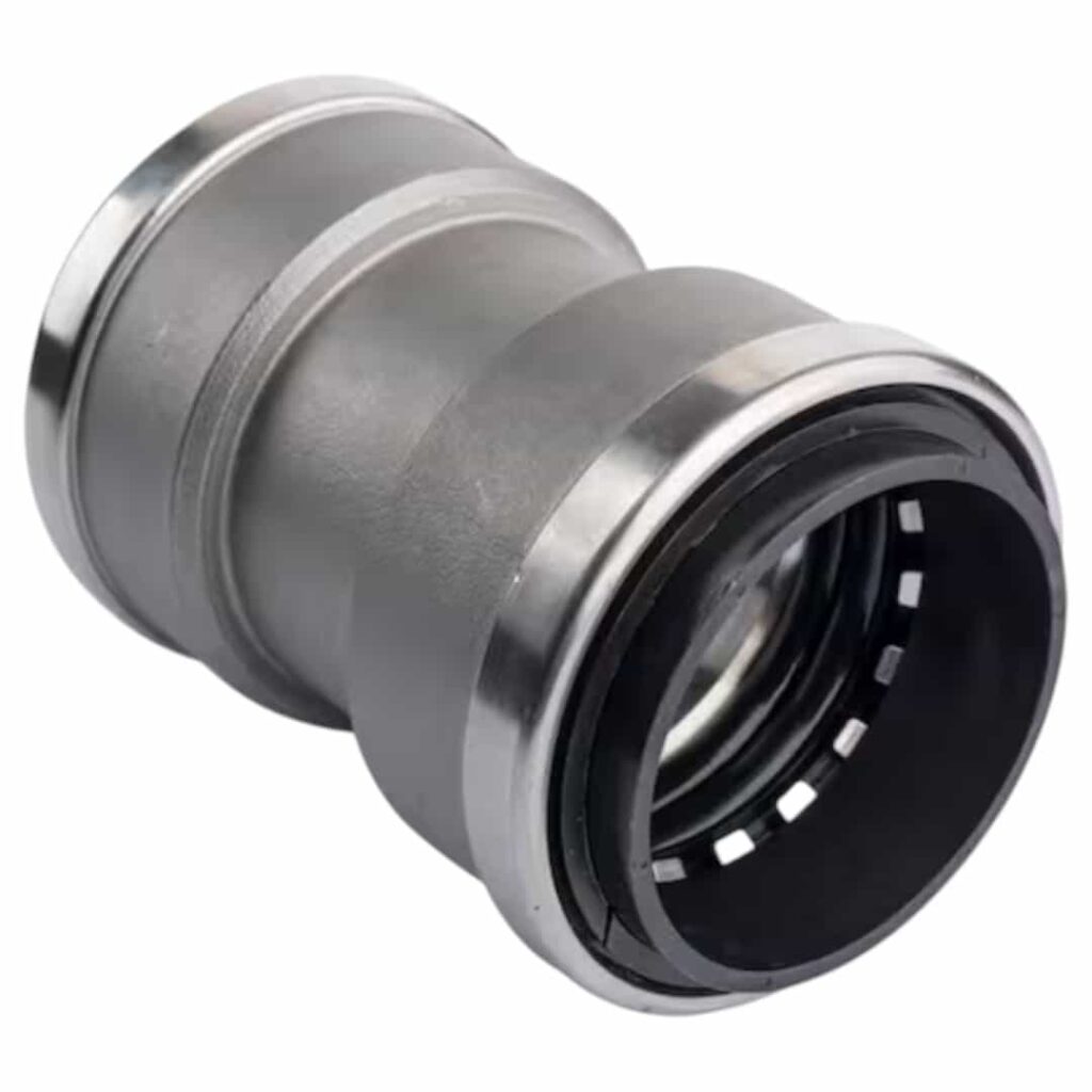 The QuickFitting Stainless Steel push fittings line features the same patented design with superior sealing performance, now upgraded with a 100% lead-free, corrosion-resistant professional grade 304 stainless steel body. These push-to-connect fittings are approved for behind-the-wall or direct burial applications and are available in sizes from 1/2-inch to 2-inch, making them suitable for plumbing and heating repairs of any size. Large-diameter fittings are reusable, durable, and provide permanent connections, completing installations up to 90% faster than traditional methods like soldering. QuickFitting’s push connection technology allows simple, safe, and cost-effective connections of Copper, PEX, and CPVC piping without the need for open flames, glues, or sealants. Removal is easy using the patented Slip Clip release tool.