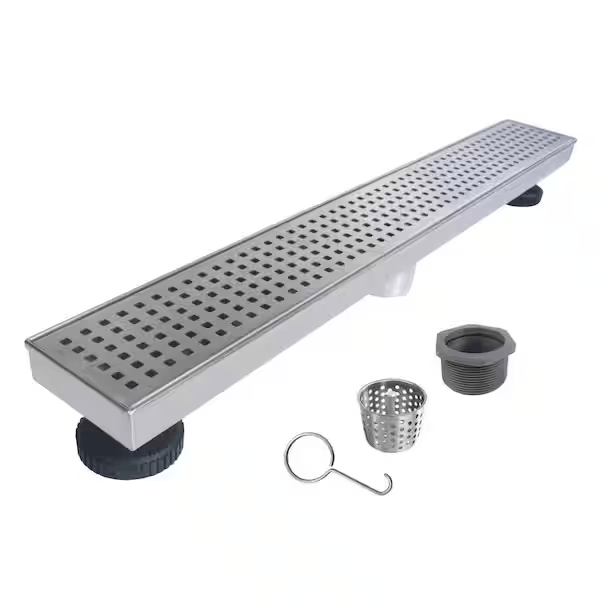 RELN shower drains are made of premium 304 stainless steel, to ensure it is as corrosive and rust resistant with a long-life span. Each drain length is slopped to achieve the best fit, and function in a tile or stone installation. RELN drains provide a great solution for curb less shower entry, with no obstacles. Equipped with 2 adjustable feet on both ends of the linear drain during installation, an installer can precisely adjust the height of the two ends to level with the ground, before pouring concrete to the shower base; avoid buying linear drain without adjustable feet or you may run into a tilted installation. Comes with a high-quality threaded adaptor with rubber O-ring that also helps in adjusting the height of the drain; the adaptor is compatible with most 2 in. PVC, ABS, and Cast-Iron Flanges. Other Bonuses – A lifting hook is included to remove the grate from the drain; a hair and debris lift-out strainer is also included to capture unwanted object to avoid clogging the pipe.