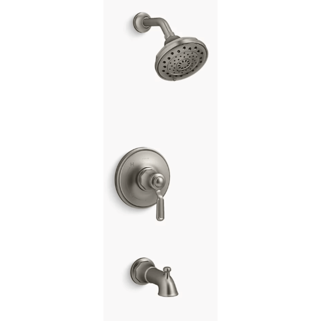 The Worth Bath and Shower Trim draws inspiration from vintage metalwork, blending bold facets with intricate detailing for an industrial chic aesthetic. With its handcrafted design, this trim brings a relaxed sophistication to both traditional and modern spaces that appreciate classic elements. The kit includes a multifunction showerhead, Rite-Temp pressure-balancing valve, single lever handle, and a bath spout.