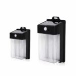 TECHKO Solar Motion Sensing Wall Light – will add a sense of safety lighting to any location. The light stays on at a medium brightness. Once the sensor has been triggered, the light comes on at a higher brightness level of lighting, and after a short time, the light will go back to the mid-level of lighting if the sensor has not been triggered. Attach to a wall, fence, pillar, etc. This unit comes with an IP65 waterproof rating allowing the unit to remain functional outside in most climates. Contains 2 solar wall sensor lights.