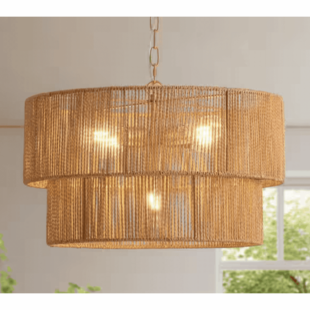 Elevate your interior with this 5-light boho-style pendant chandelier, featuring a handcrafted double-drum shade made from natural jute rope. The soft gold metal finish adds a modern touch to its organic texture, casting a warm, inviting glow that complements coastal, bohemian, or farmhouse-inspired spaces. Designed with 5 E26 sockets for customizable brightness, this chandelier is ideal for dining rooms, bedrooms, living rooms, or entryways. An adjustable hanging chain and sloped ceiling compatibility ensure hassle-free installation, and pairing with dimmable bulbs allows you to set the perfect ambiance.