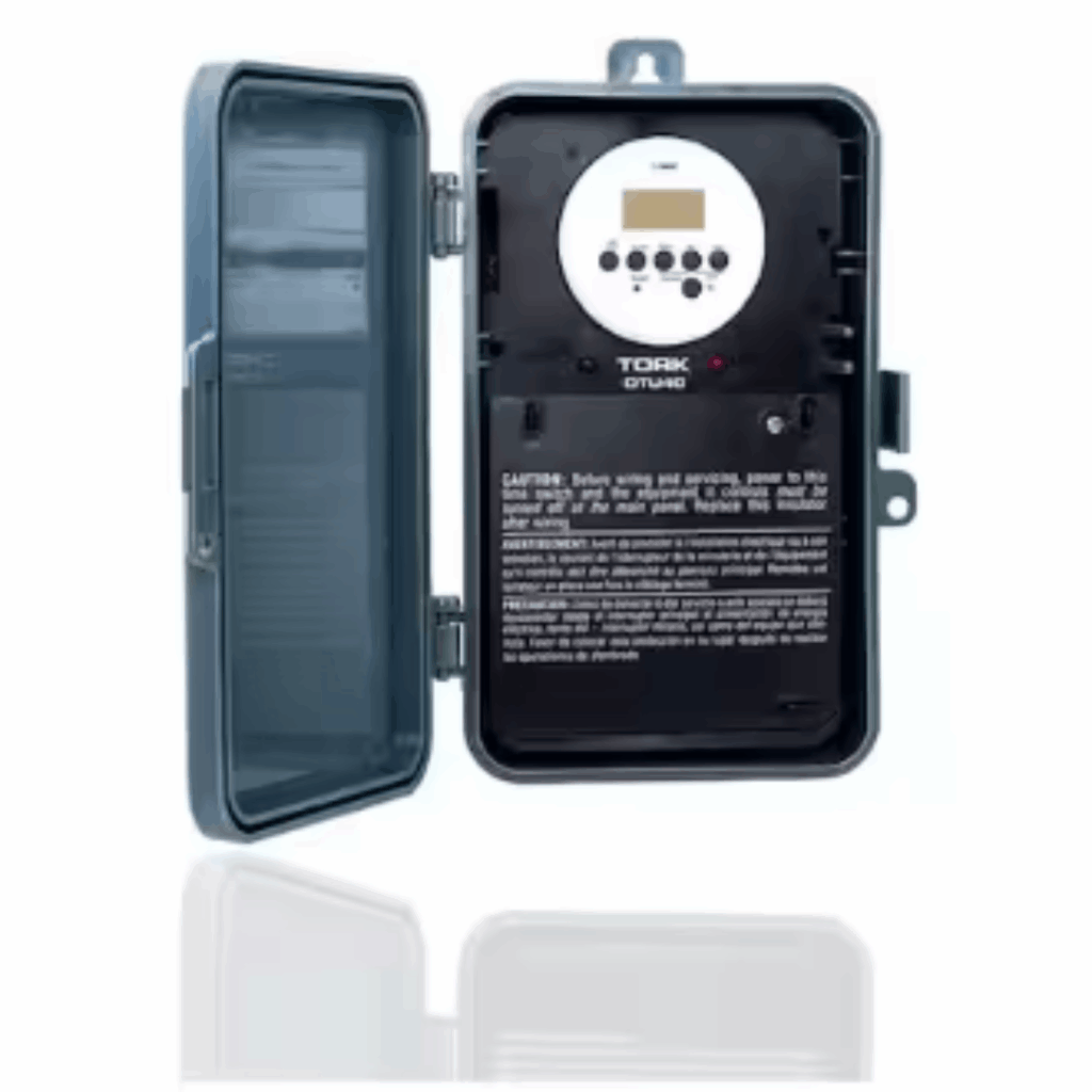 The Universal Multi-Voltage 40-Amp, 7-Day Digital Time Switch is ideal for controlling lighting, pumps, signs, air conditioning, water heaters, and fans. Designed for convenience, it features a simple manual button adjustment for daylight savings time. Housed in a heavy-duty NEMA 3R indoor/outdoor enclosure, the tamper-resistant metal construction protects the timer from weather and damage.