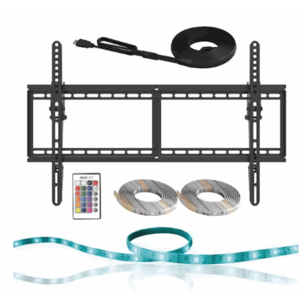 Enhance your entertainment experience with the AuraLED ColorHome TV Bundle. This combo pack has everything you need for an upgraded viewing setup, including a durable full-motion wall mount for versatile angles and a universal swivel bracket compatible with 32-65 in. TV screens. A 10 ft. HDMI cable connects your devices seamlessly, while two 6.5 ft. LED tape lights attach to the back of your screen, adding an immersive glow and reducing eye strain during extended viewing sessions.