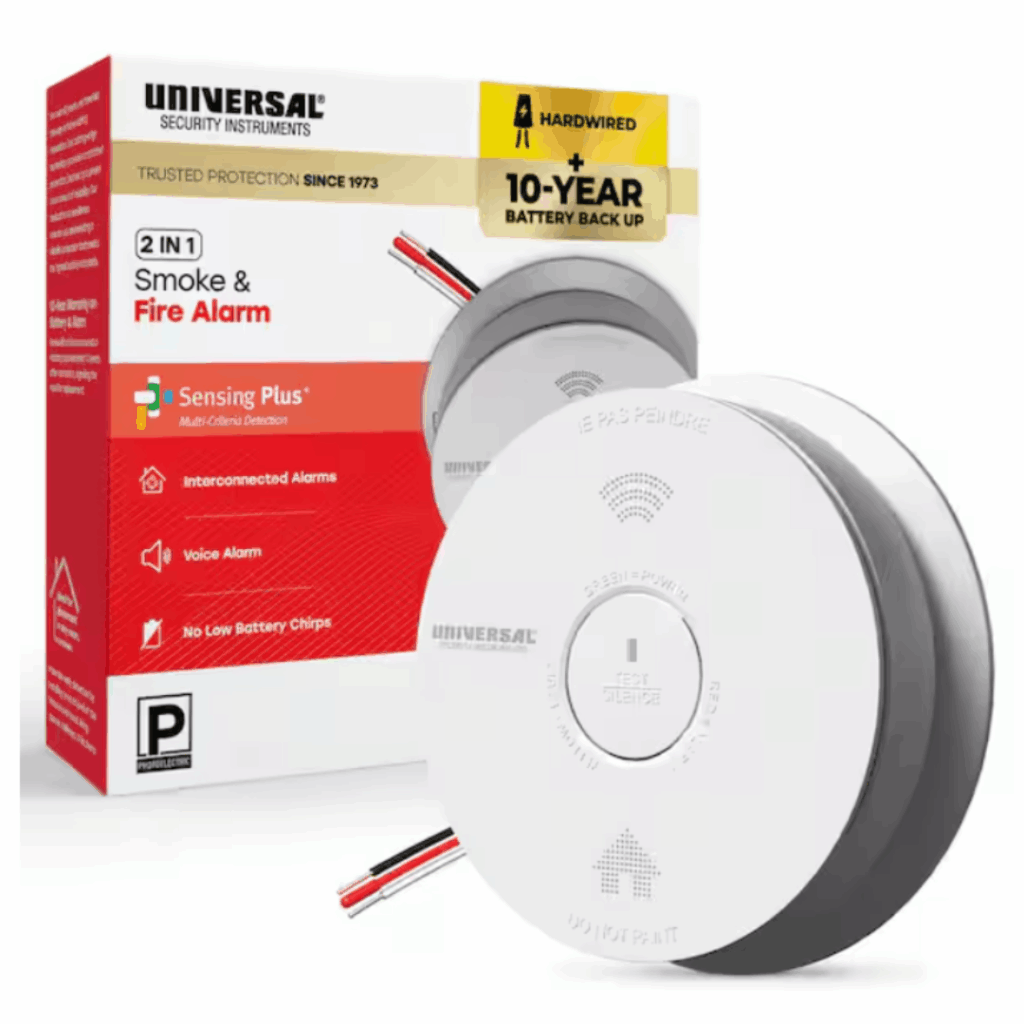 The USI Hardwired Smoke Alarm with 10-Year Battery Backup delivers advanced protection for your home. Featuring Sensing Plus Multi-Criteria Detection, this alarm quickly and accurately detects both slow-smoldering and fast-flaming fires, ensuring early warning and faster response. It can be interconnected with other hardwired alarms in your home to provide full coverage.