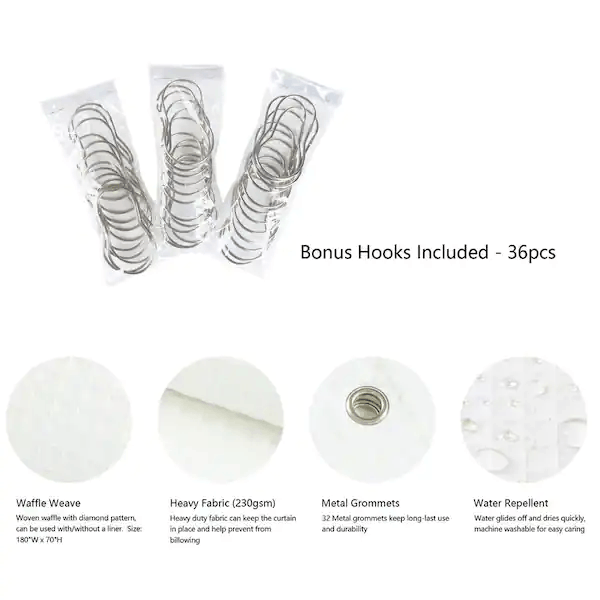 - EASY INSTALLATION AND MAINTENANCE: Our bathroom curtain’s size of 180″ x 70″ makes it great for wrap around shower enclosures and claw foot tub showers without using 2 or 3 separate bathroom curtains. This shower curtain set also includes 36 hooks for installation. Our waffle knit shower curtain is also effortless to maintain. These bathroom shower curtains are machine washable in cold water in a gentle cycle setting and tumble dry. Cool iron if needed.