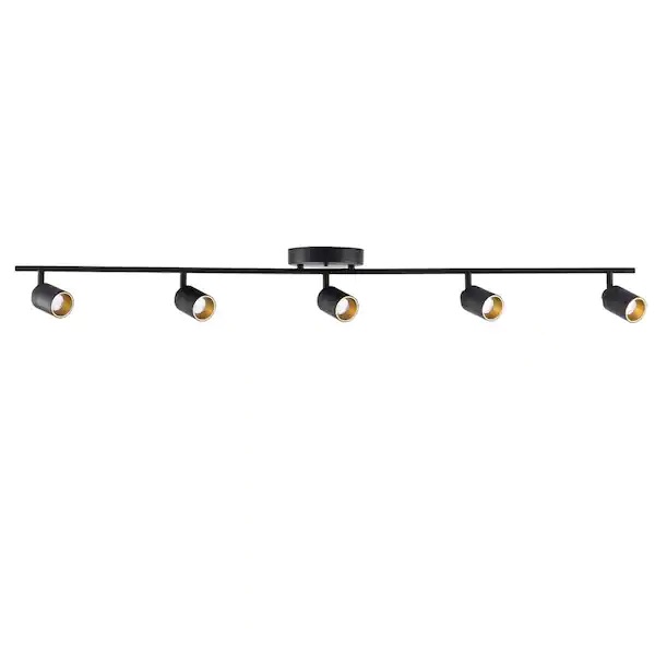 - Interior track light: this fixed rail track light features 5 rotating spot lights dropping down from a black aluminum track, the interior of each head is accented by brushed gold for modern look