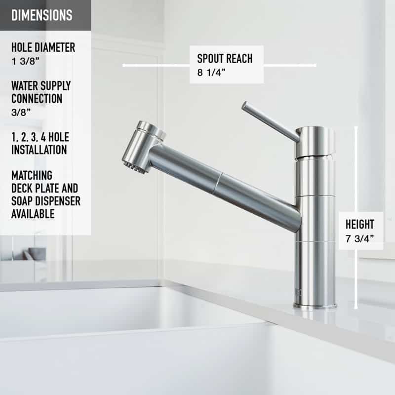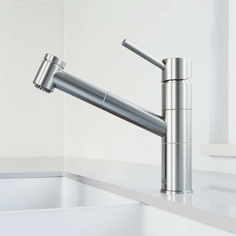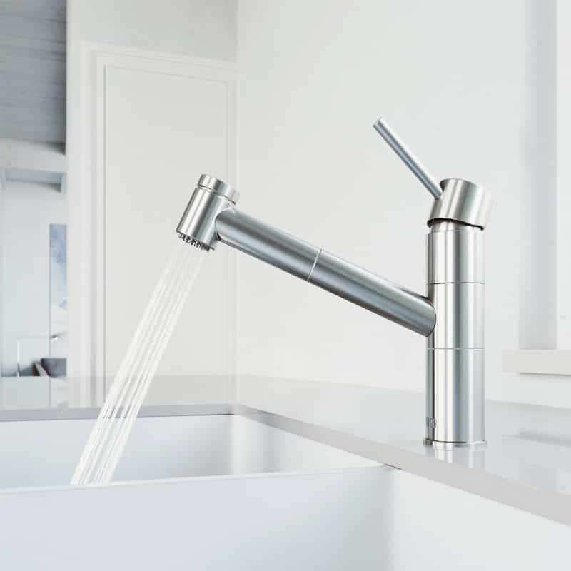 The VIGO Branson Pull-Out Spray Kitchen Faucet brings modern freshness to any sized kitchen with its sleek lines and low profile. This functional faucet features a dual action, pull-out spray head and 360° swivel spout that is extendable up to 30″. Solid brass construction and corrosion resistant finish ensure durability.