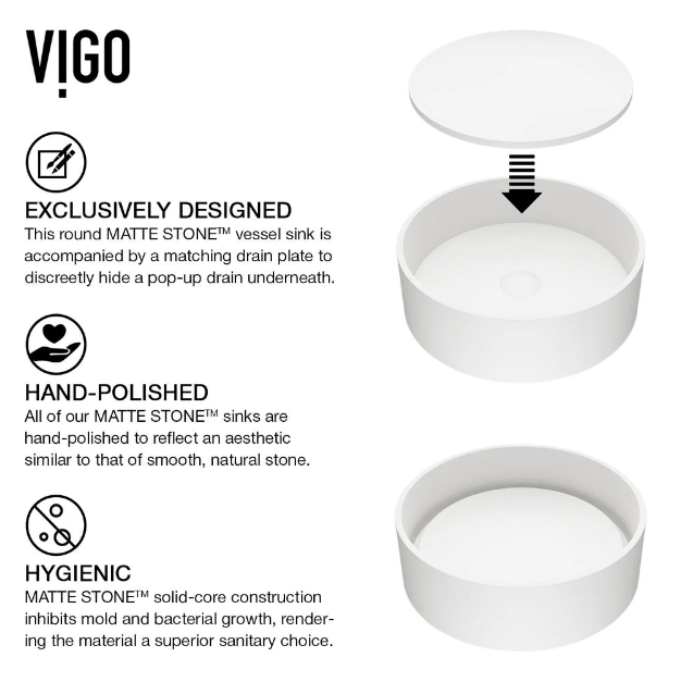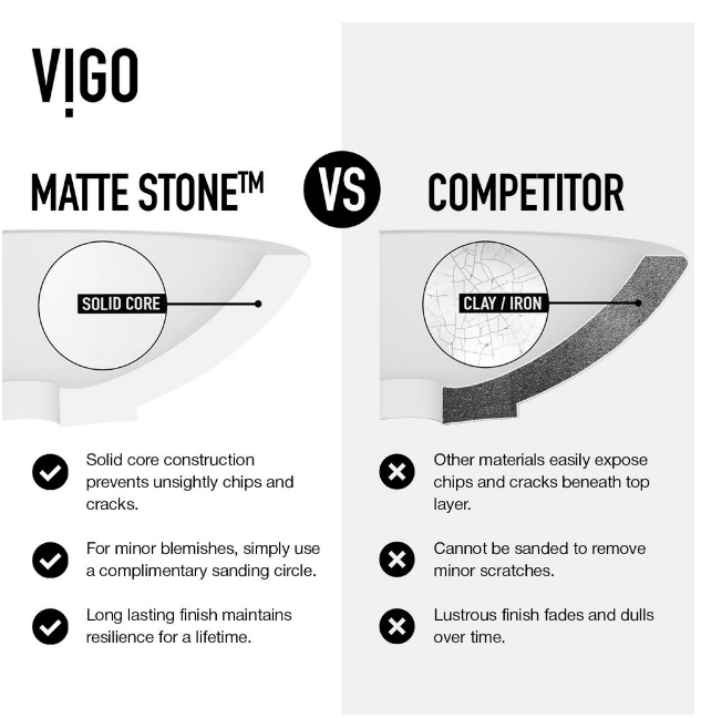 - MATTE STONE TM: VIGO’s proprietary solid core composite is smooth, non-porous and naturally hygienic that expertly resists scratches, fading, and impact