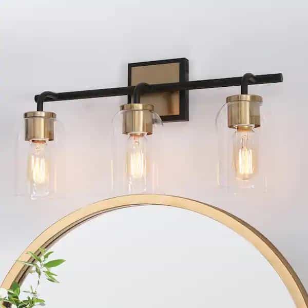 Consisting of a slender metal bar and individual curved arms, this 3-light bath bar vanity light is a perfect blending of modern, classic, and traditional elements, bringing a new modern yet vintage look for your house decor. The black frame on the outside of the brass canopy and the no-exaggerated curves present careful design in detail and make the wall light more distinctive. With clear glass shades and higher compatible bulb wattage (60W maximum), there is no worry about the brightness in your bathroom, powder room, entryway, and any other space you want to update.