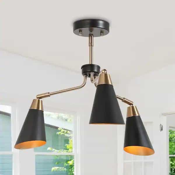 The modern industrial style indoor lighting. Enhance your entryway, kitchen or dining room with this 3-light semi-flush mount ceiling light. Give your home a retro industrial look with this black lamp in sturdy metal and a classic black and brass gold finish. This semi-flush mount light includes a matching round ceiling plate.